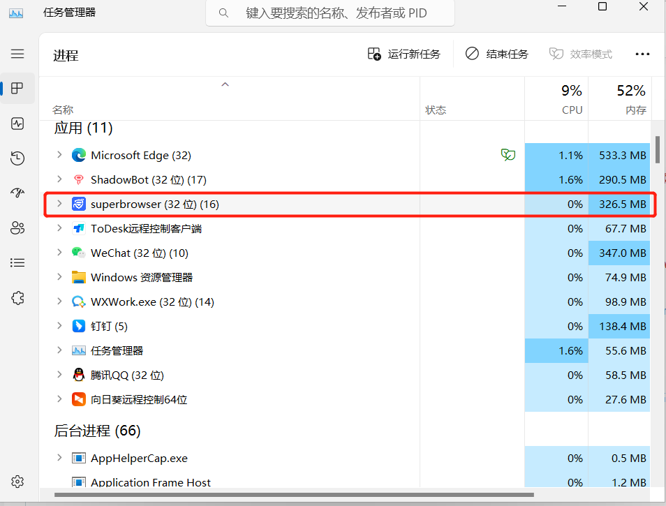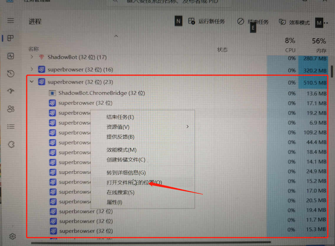 打开紫鸟浏览器后打开任务管理器,找到浏览器的可执行文件路径。注:浏览器的进程名是superbrowser,启动器的进程名是Launcher,需要获取superbrowser.exe的可执行文件路径。