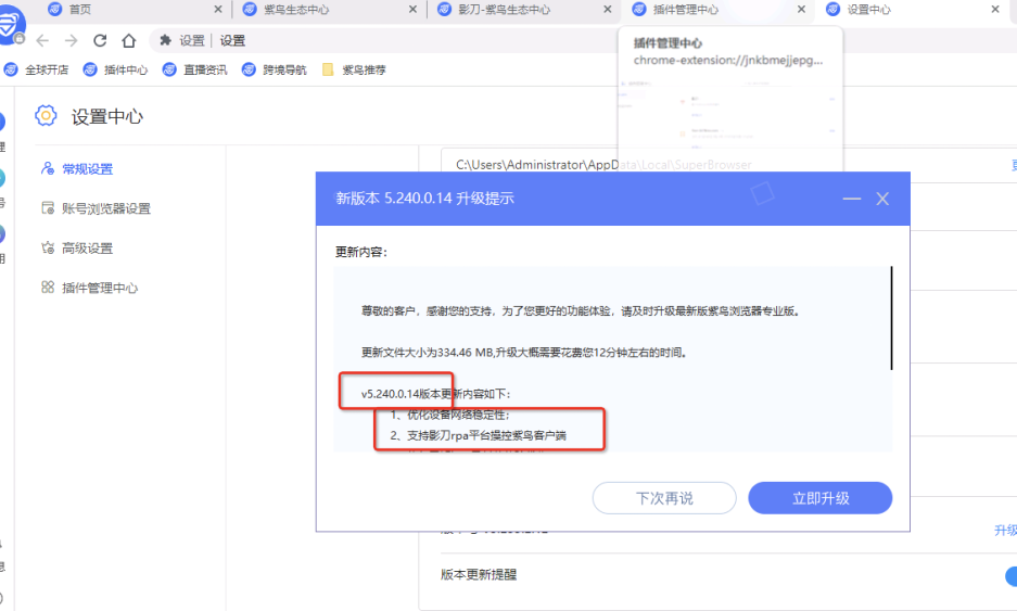 But时代变了~经过双方不断的沟通交流,影刀现在已经再次支持操作紫鸟浏览器了。还有一些小伙伴在紫鸟自动化方面有些疑问,小白在这边分享如何安装自动化插件以及踩坑的一些经验。(后附几个问题点)