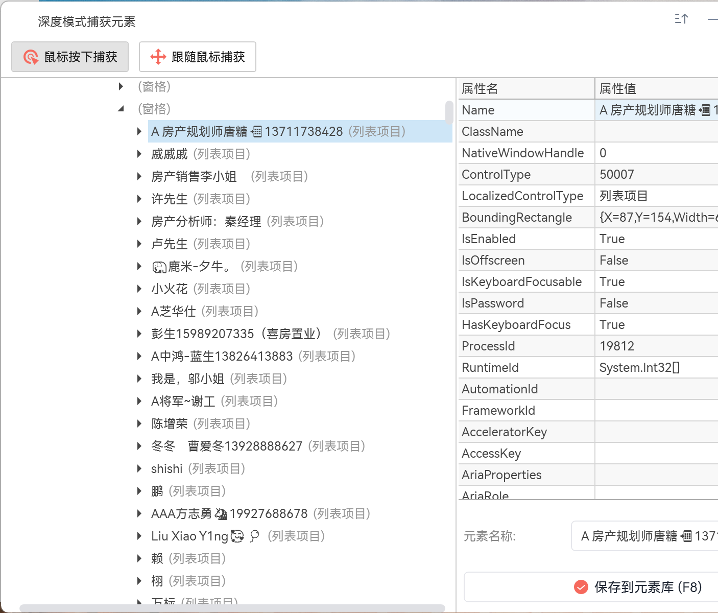 这个是我用深度模式捕获在我的微信PC版里找到的微信群成员,我才能把全部的名字提取出来放在变量里。