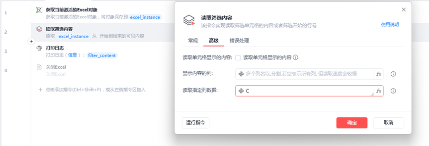 可是当使用“读取筛选内容”指令的时候发现,读取数据的模式下虽然能够在高级里面读取列但是数据都在元组里面,不好处理如下: