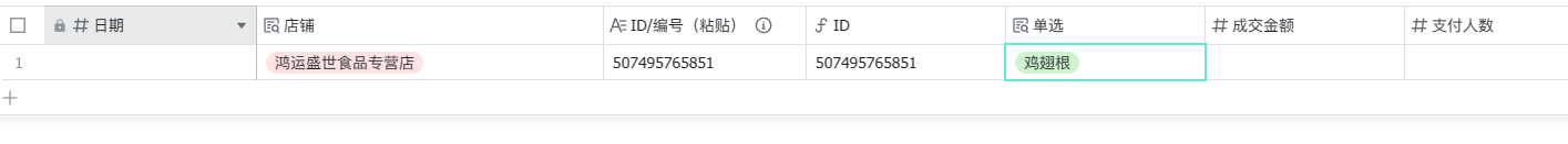 [{'fields': {'ID': [{'text': '376282305945', 'type': 'text'}], 'ID/编号(粘贴)': '376282305945', '单选': ['opt3ZdSLMp'], '店铺': ['optJjPTcOH'], '日期': '49', '父记录': [{'table_id': 'tblF8sgprcX2upAy', 'text_arr': [], 'type': 'text'}]}, 'id': 'rect2j14sT', 'record_id': 'rect2j14sT'}, {'fields': {'父记录': [{'table_id': 'tblF8sgprcX2upAy