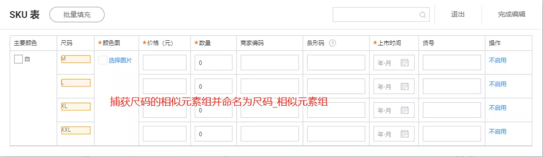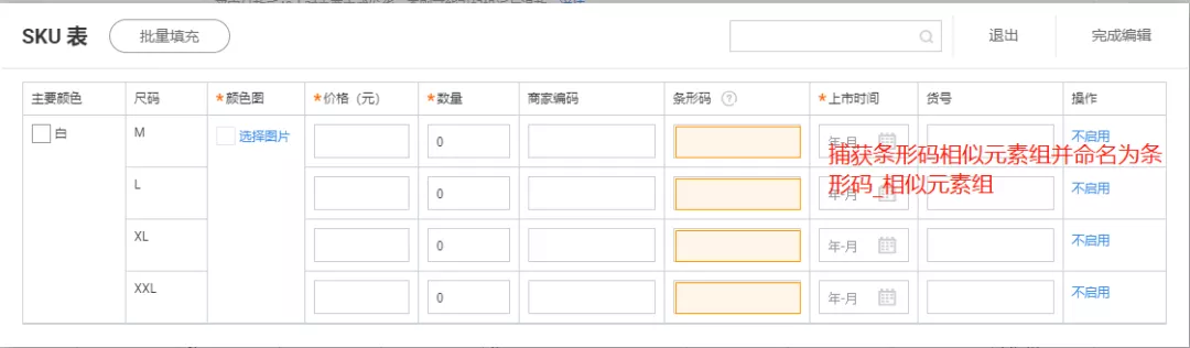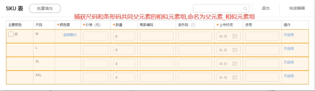 Step1:捕获元素,捕获尺码文本/条形码输入框及其共同父元素的相似元素