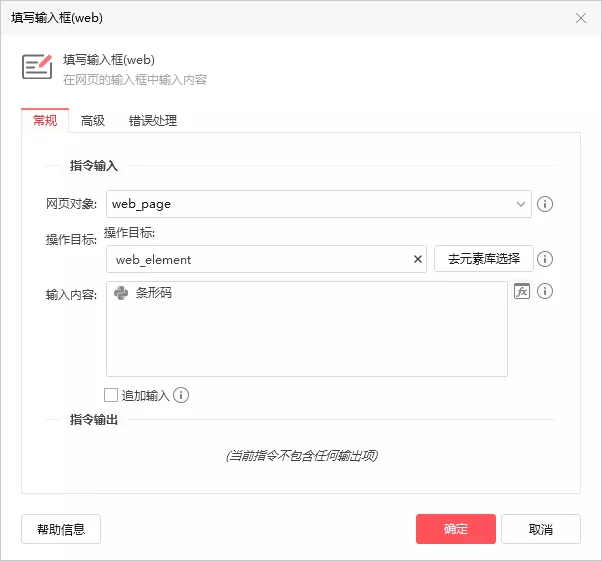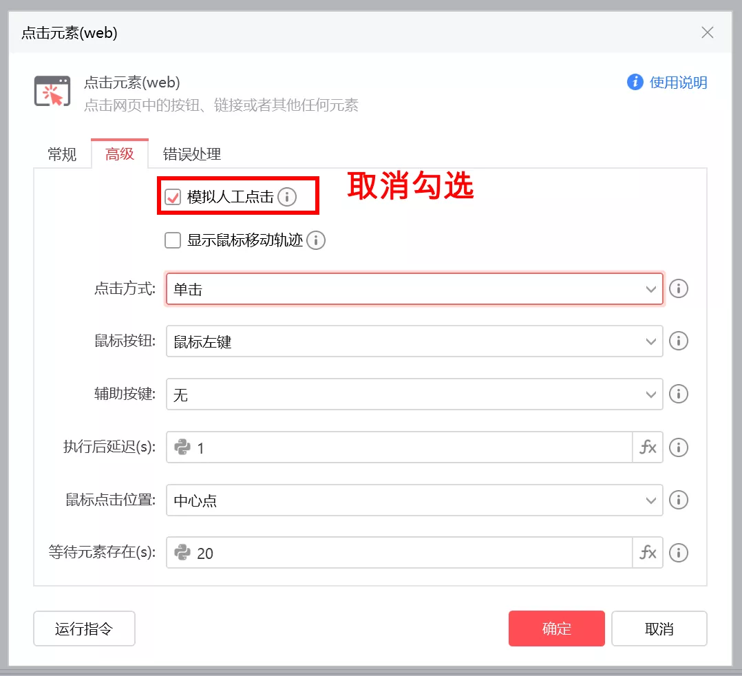 在【点击网页元素】、【悬停在网页元素上】、【填写输入框】等网页元素配置框的【高级】选项区,取消模拟人工输入的勾选