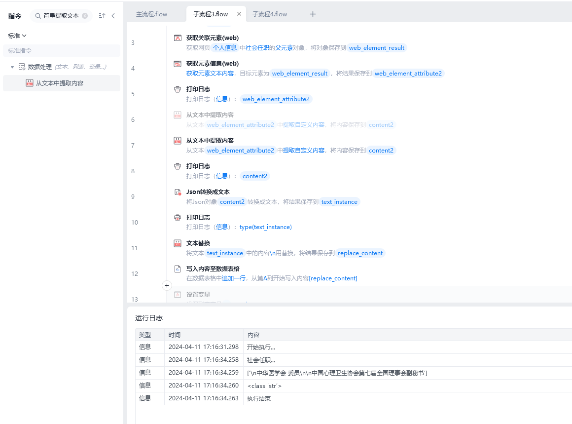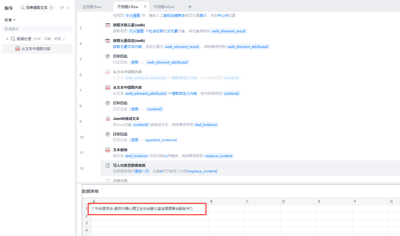 命令现在是这么写的,不明白的json转换成文本,再从文本提取内容,怎么还有[]?,我想最终写到表格的内容是不包含[]和“”的
