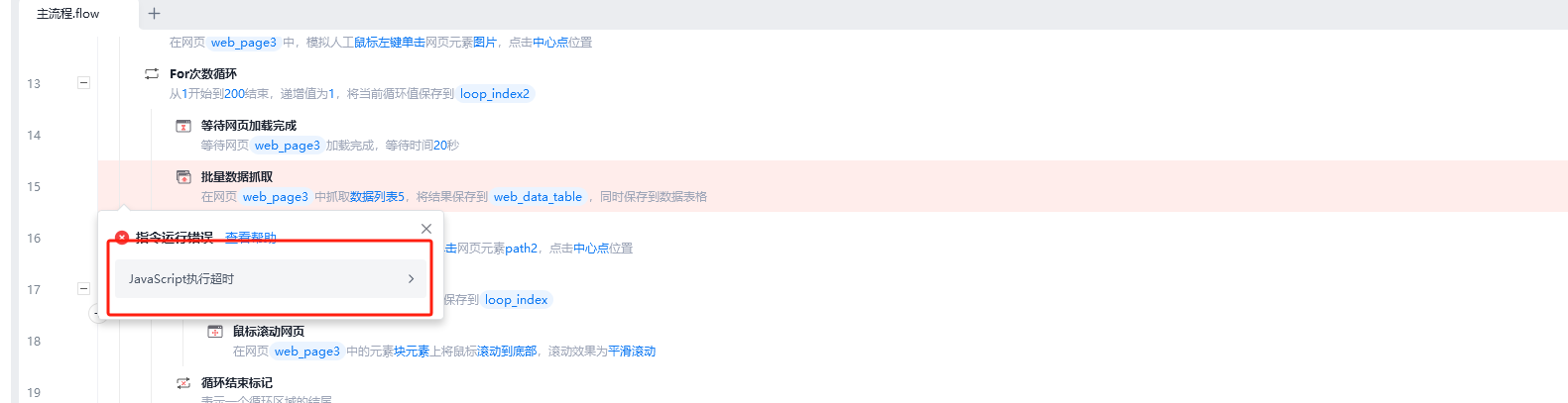 切换网页在执行抓取就出现JavaScript执行超时的问题,页面也没出现新的问题,数据抓取只有几个字段,麻烦大佬帮助