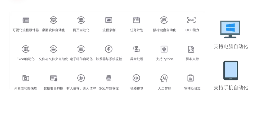 影刀RPA具备以下五个方面的自动化能力:桌面软件及Web程序自动化、手机自动化、鼠标键盘自动化、Excel自动化、数据库及SQL自动化。