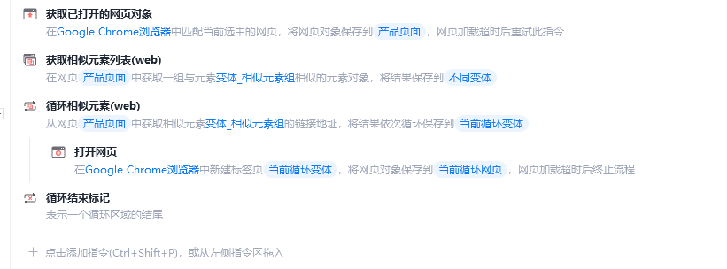 类似1688的那种产品链接,该产品有四种颜色,我的目的是获取四个颜色所在产品的网址和标题,我试了循环这四个颜色的相似元素列表并点击元素,但是得出的标题不太对劲有重复项,所以我打算循环这几个颜色,打开新的标签页然后再获取标题,情况是直接点击并不能打开新的标签页,结果循环颜色的相似元素列表却只得到了图片的链接,我用鼠标单击右键能够看到它有产品链接和图片链接,但是单击右键以后的那个菜单是无法获取的,这种情况我还是想获取图片中的产品链接,该怎么办呢?