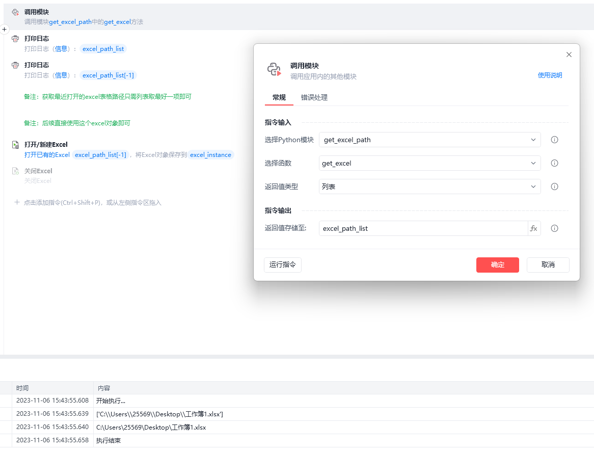 通过win32com库获取到所以已打开的excel路径,存放在列表里面,然后在使用【打开/新建excel】指令去打开excel,然后再去执行相应的操作。获取到的excel路径列表的排序和打开excel的顺序一致,使用的时候可以按照打开excel的时间去获取对应的excel路径列表的项,如果只需要获取最新打开的excel路径,只需列表取最后一项即可。
