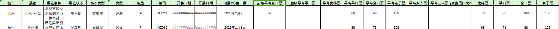 想把这张表的列名转换为(城市,展馆,...,票种名称,价格)这种形式,就是把有关票名称的列转为票种名称列里的内容,如何实现呢?类似下边这种。