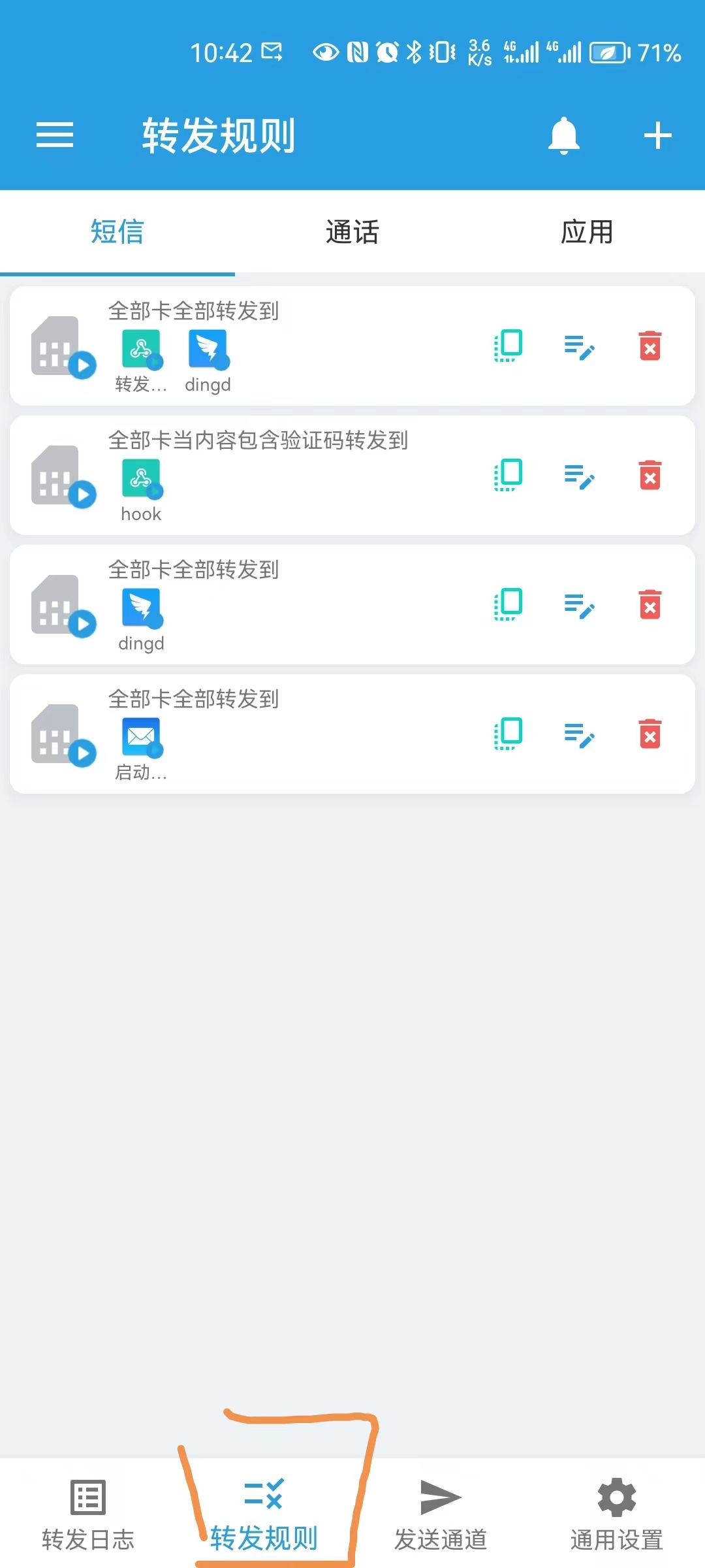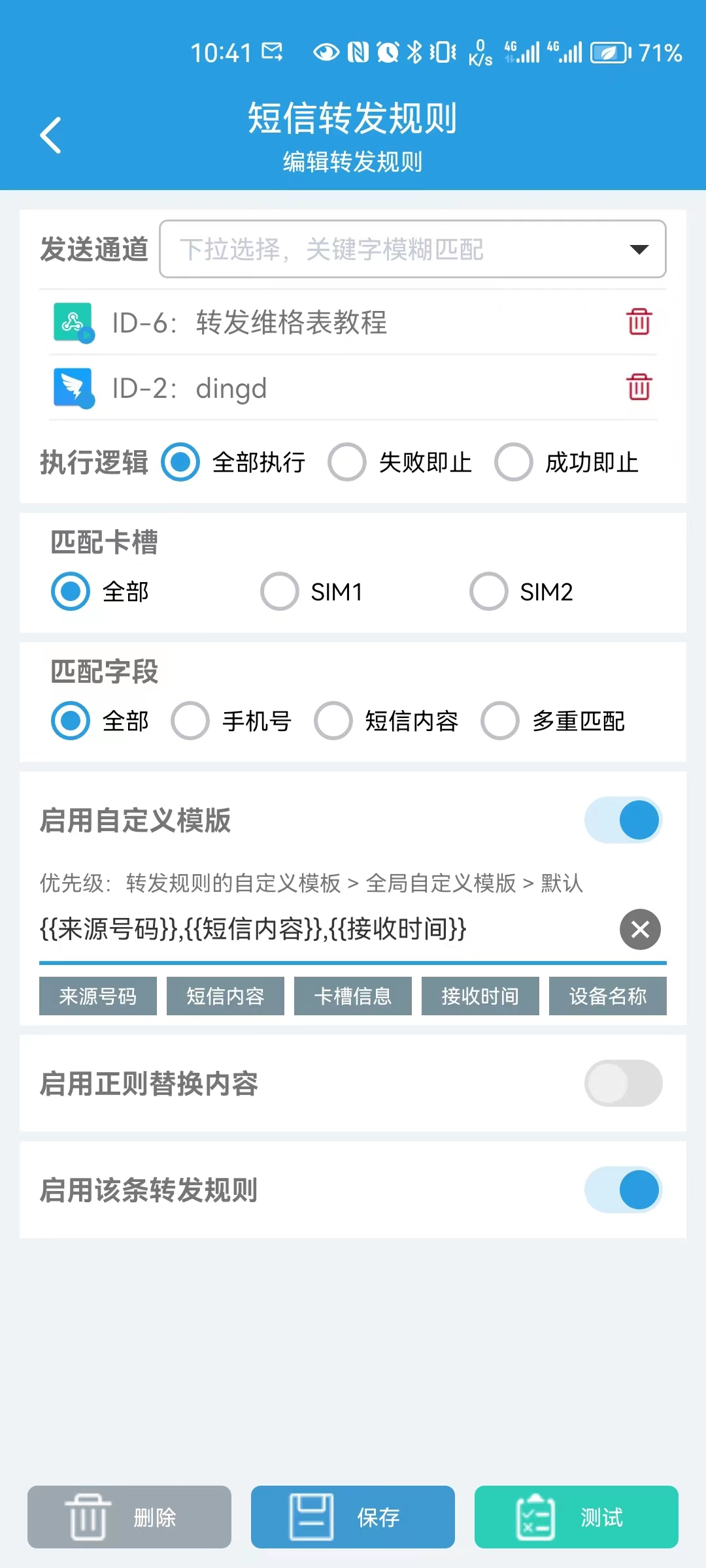 点击转发规则 | 配置发送通道及自定义模板 | 测试是否配置成功 |