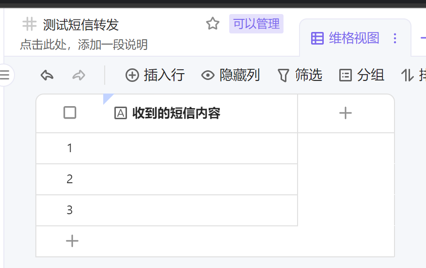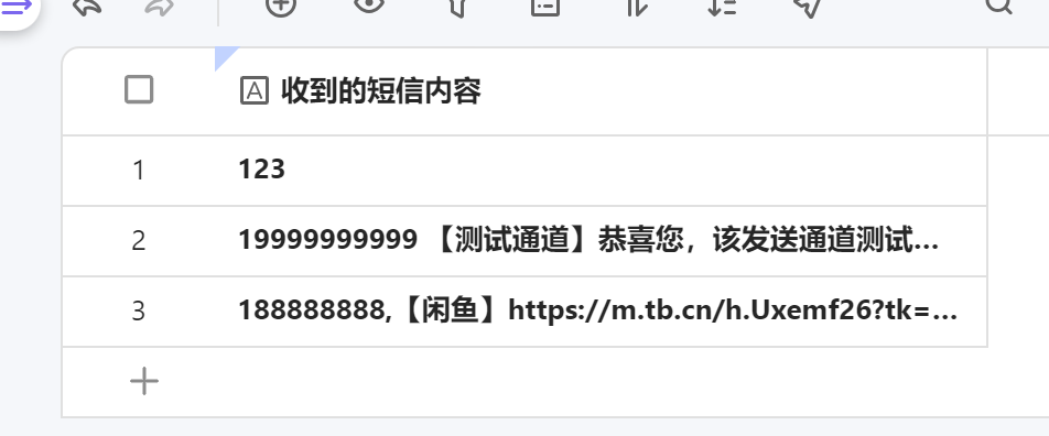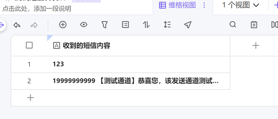 创建用于接收验证码的维格表,并配置一个字段,用于接收短信转发来的内容,如下表:
