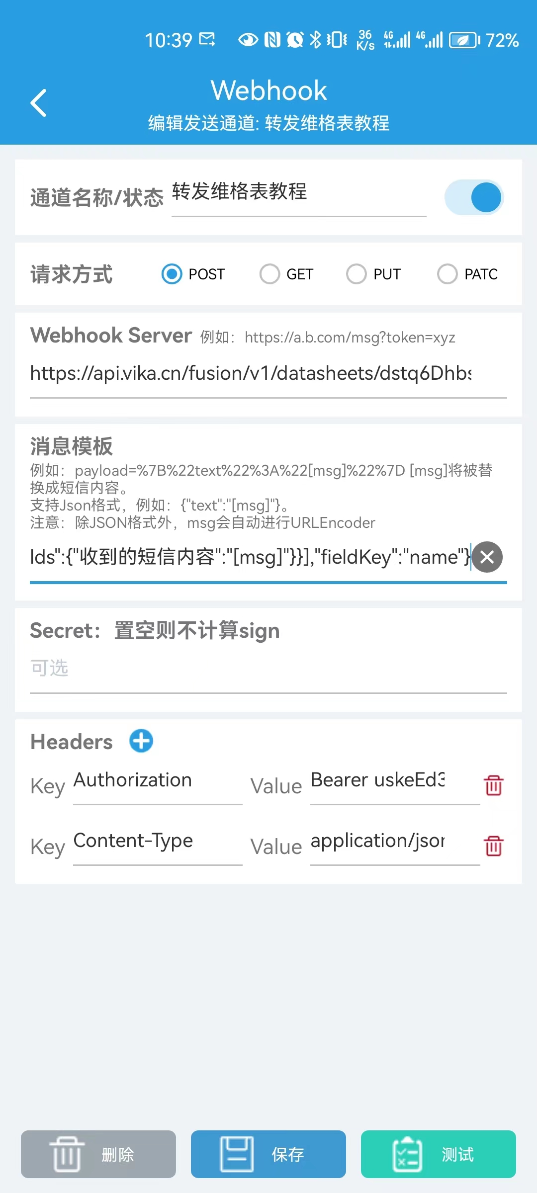 f.配置完毕后,点击测试,并输入一条短信内容,点击请求后,可以观察到维格表已经成功更新了一条记录