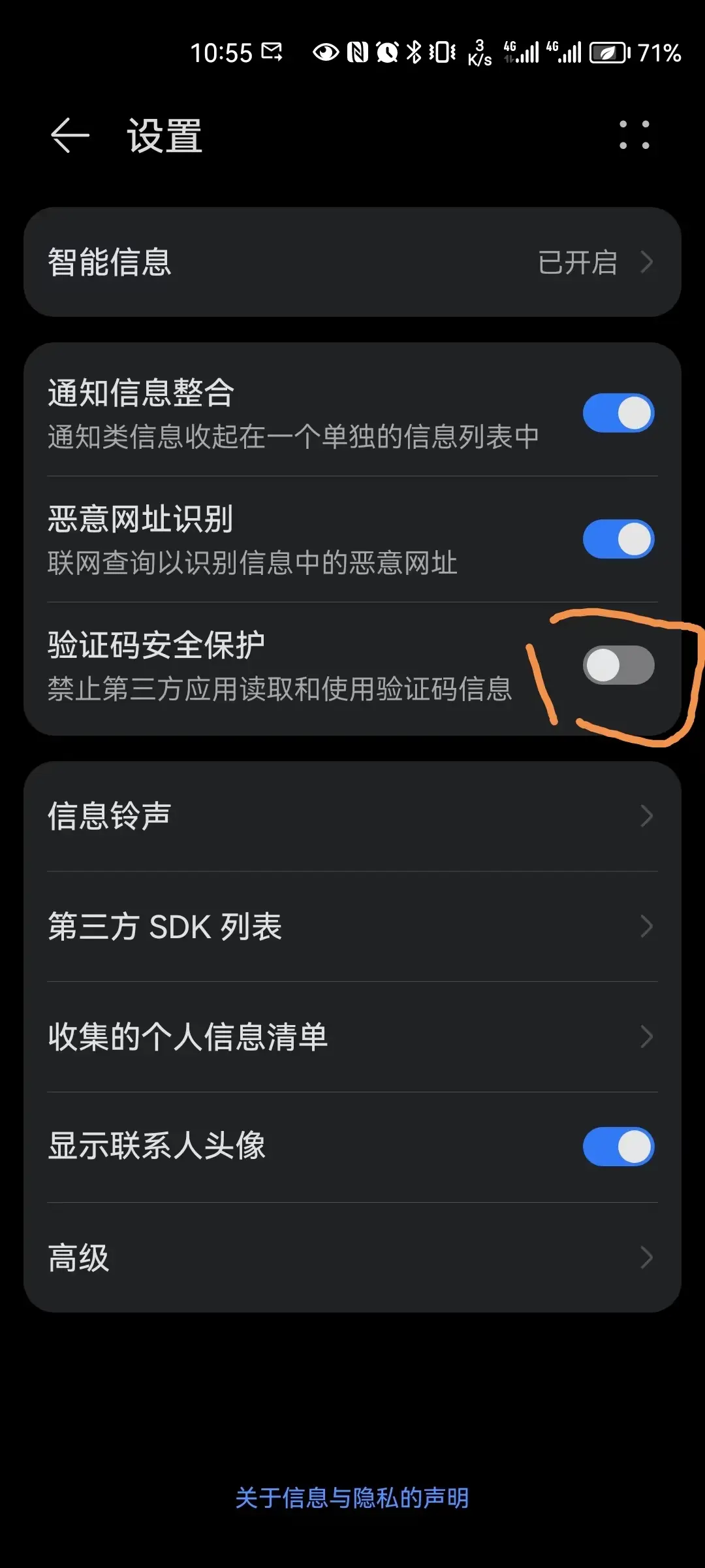 g.其他的问题,有些手机的验证码会被系统加密,不允许第三方软件读取,这时候需要将手机设置的验证码安全保护的权限进行关闭,以华为的鸿蒙系统为例,在手机设置中搜索"验证码安全保护",并将"禁止第三方获取"的权限关闭,就可以正常让软件拿到验证码: