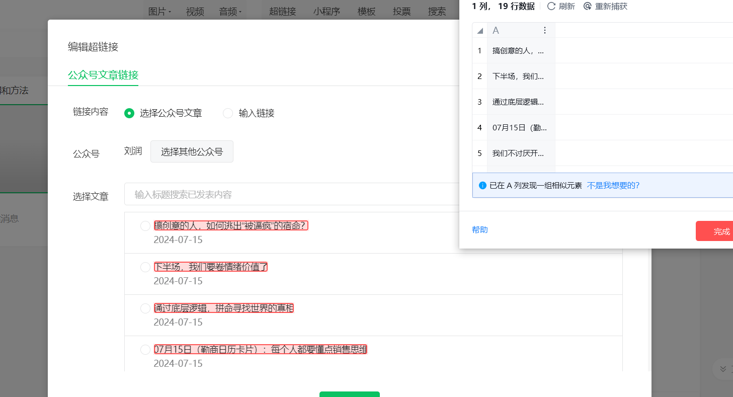我要抓取公众号的所有文章,用插入超链接的方式,但是只能获取到标题,获取不了链接