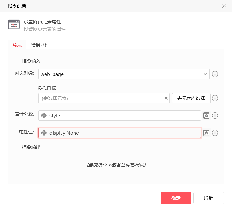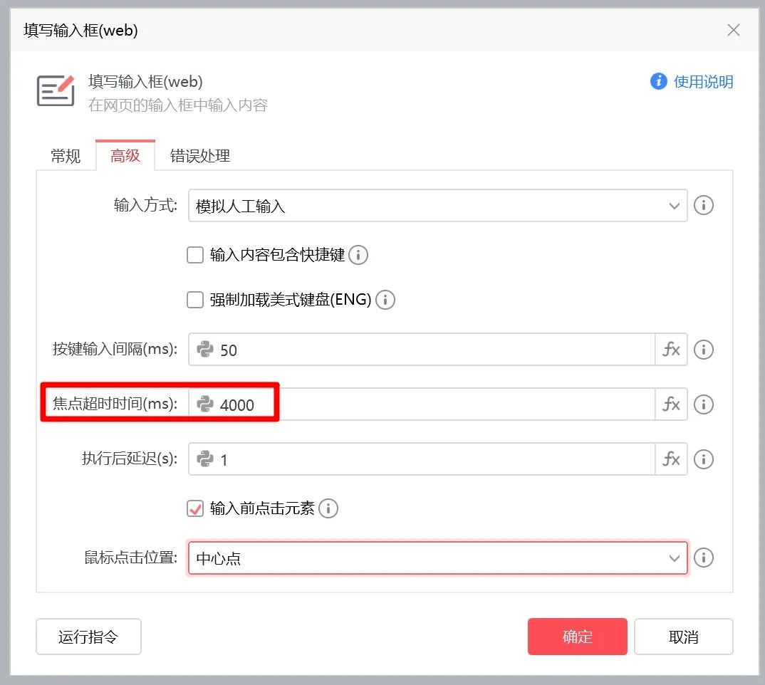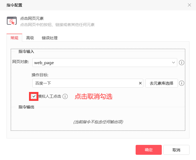 指令配置:在【点击网页元素】、【悬停在网页元素上】、【填写输入框】等网页元素配置框的【高级】选项区,取消模拟人工输入的勾选。