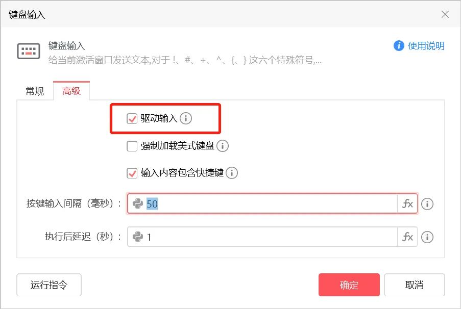 Step2:使用鼠标键盘自动化中的键盘输入替代输入框输入,并在高级中勾选“驱动输入”
