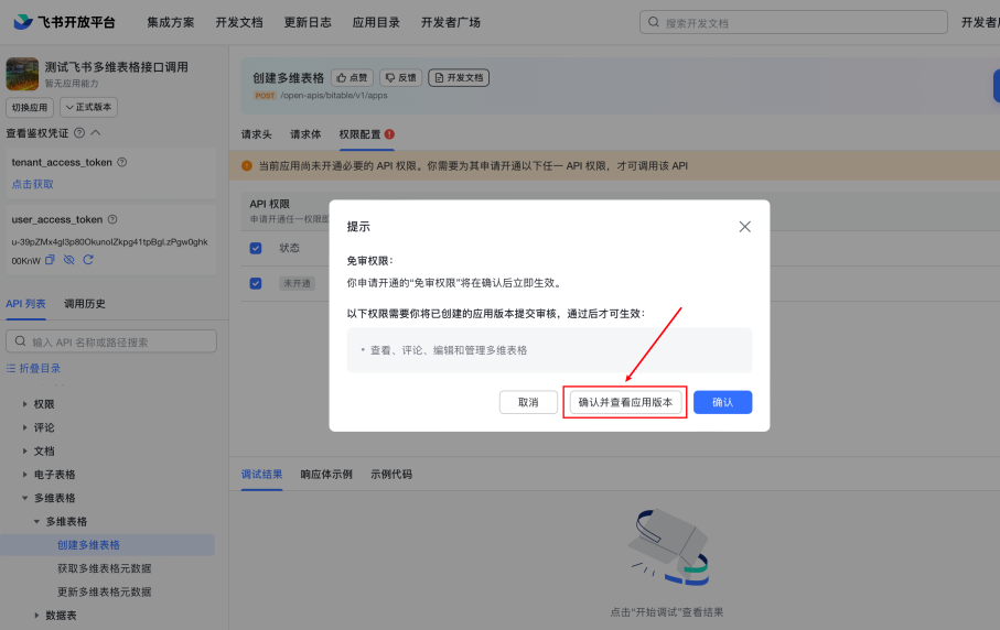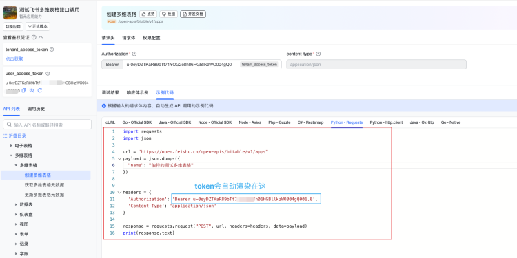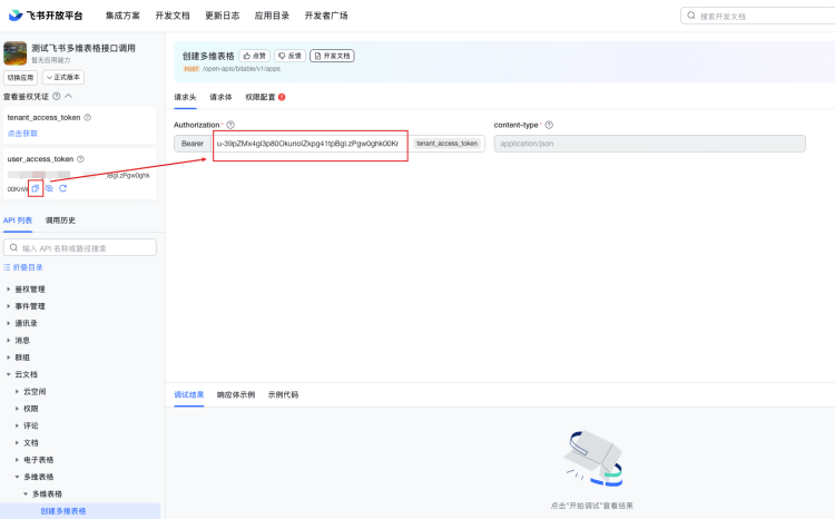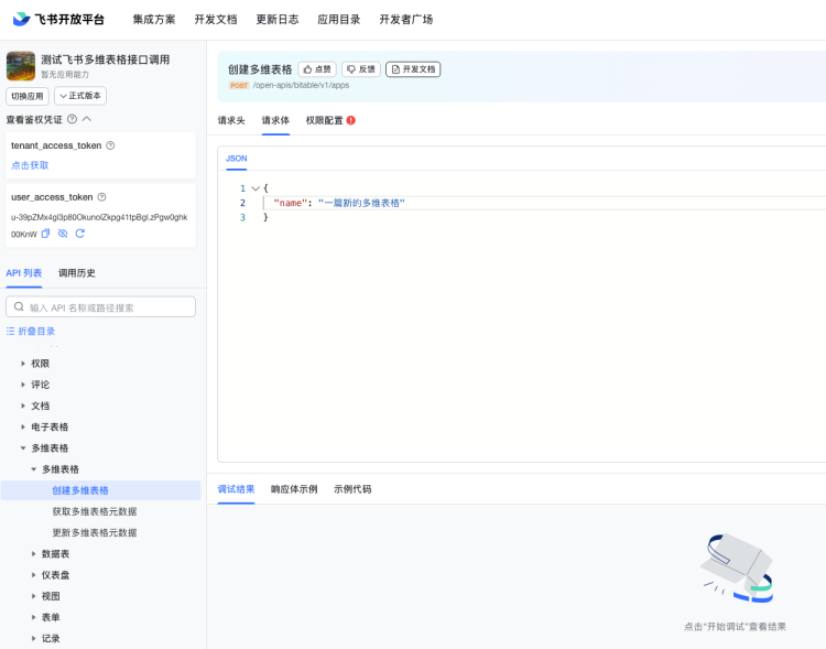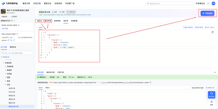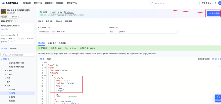 输入Authorizationtoken、app_token和table_id之后,再输入请求体,然后点击开始调试