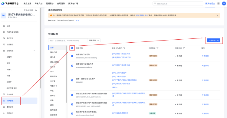 点击权限管理,然后拉到最下面,点击全部权限,再点击批量开通