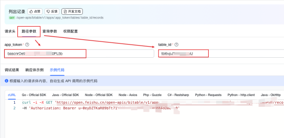 路径参数这里需要apptoken和tableid