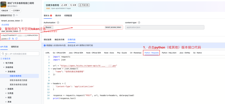 先获取飞书账号token,将 等会 创建的多维表格权限赋予当前飞书账号