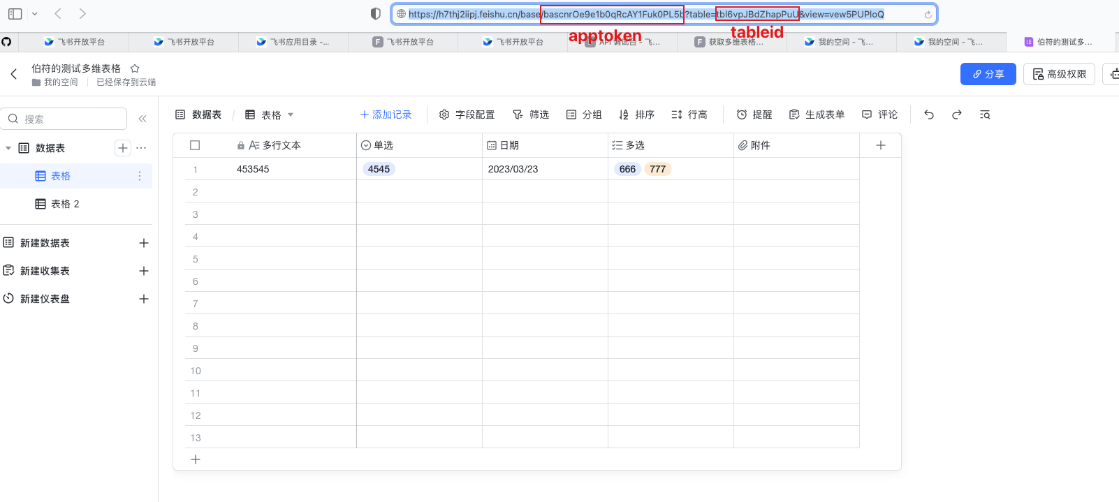 在飞书多维表格的路径可以找到apptoken和tableid