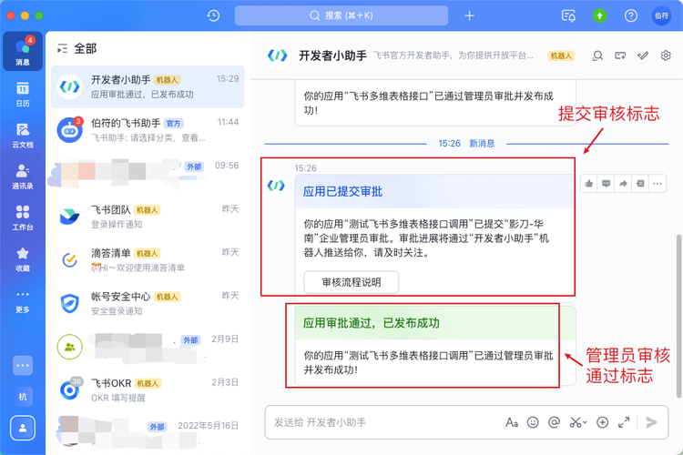 可以在飞书客户端看到审核状态