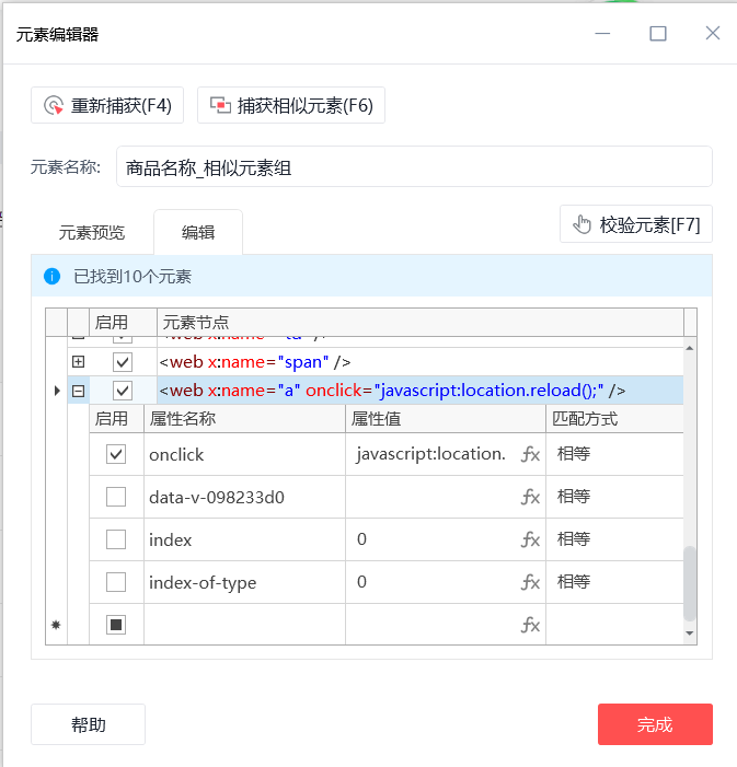勾选了onclick,可以捕捉到商品名称10个元素,不勾选会把确认发货一起捕获。
