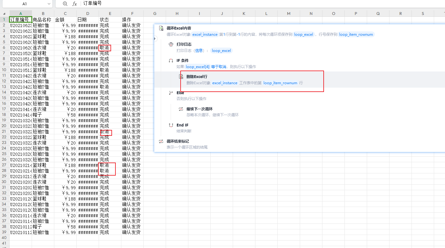 需求:循环Excel表格中的每一行订单信息,将状态为取消的订单信息执行删除整行操作??