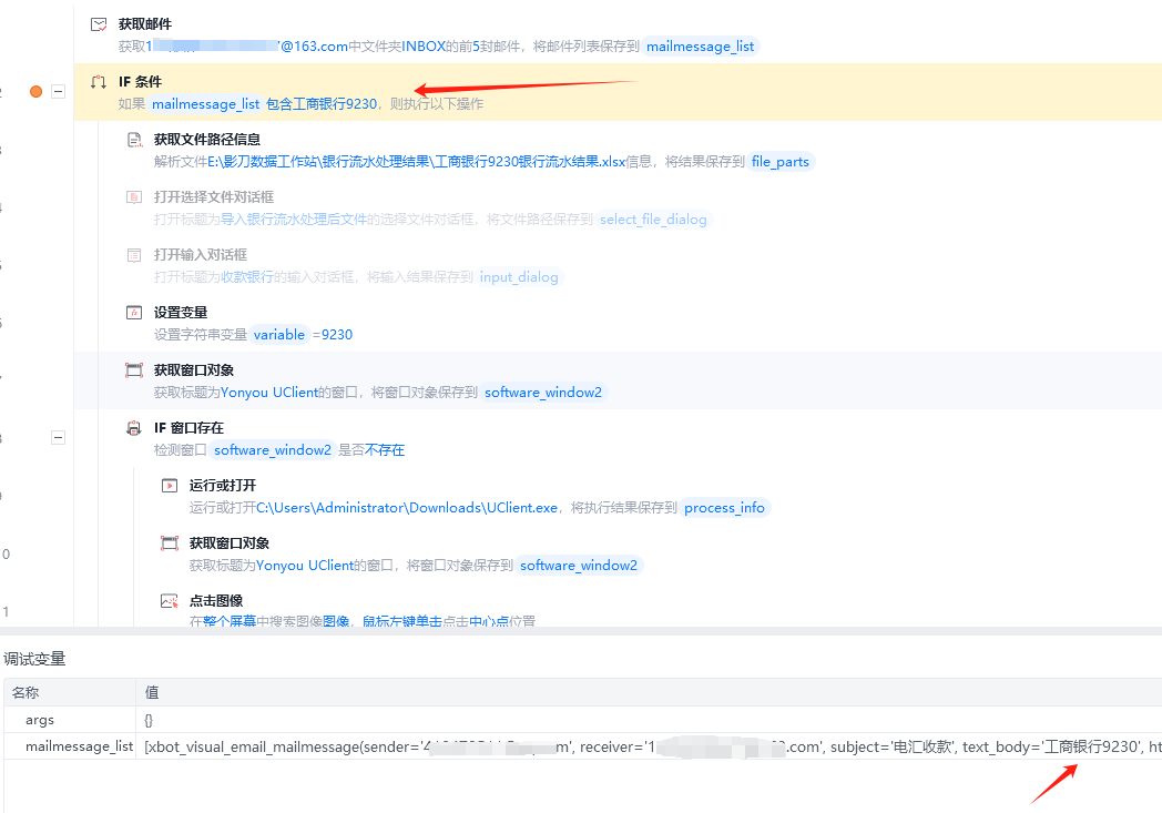 我想使用if来判断所获取的邮件信息当中的内容,如果是工商银行9230,就执行下列操作,我打断点也能看到,确实获取了信息,但是执行的表现是这个mailmessage_list不包含工商银行9230,直接就结束了,这是怎么回事呀?