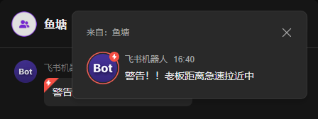 大家使用机器人进行飞书群通知时,通常会进行@操作来传递相关的信息,但是作为现代打工仔,你一定有很多很多重要的“工作”群聊吧,那么摸鱼忙碌的时候,我们很容易忽略@信息而继续”认真“工作