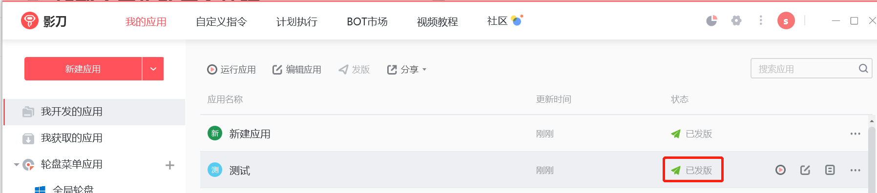 我自己在影刀开发了一个应用,发版了,就下面这个“测试“的应用