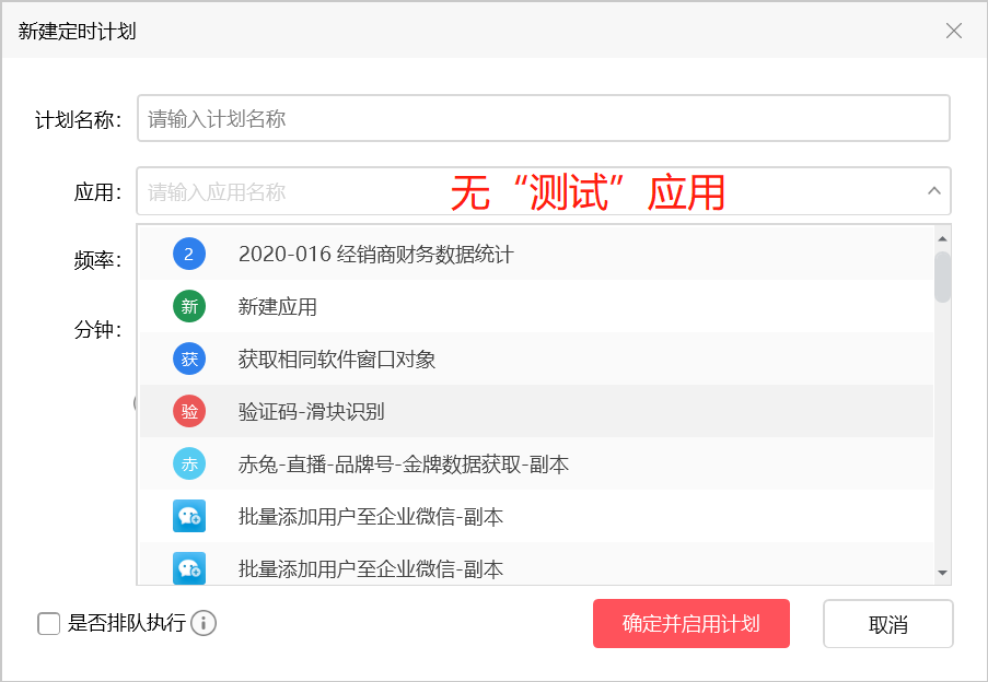 然后我去计划执行里面想定时执行这个计划,但是应用那个地方没有我发版过的这个应用