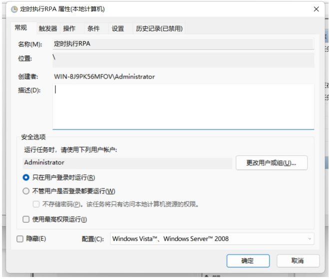 【安全选项】:此处有两种形式,“只在用户登录时运行”和“不管用户是否登录都要运行”