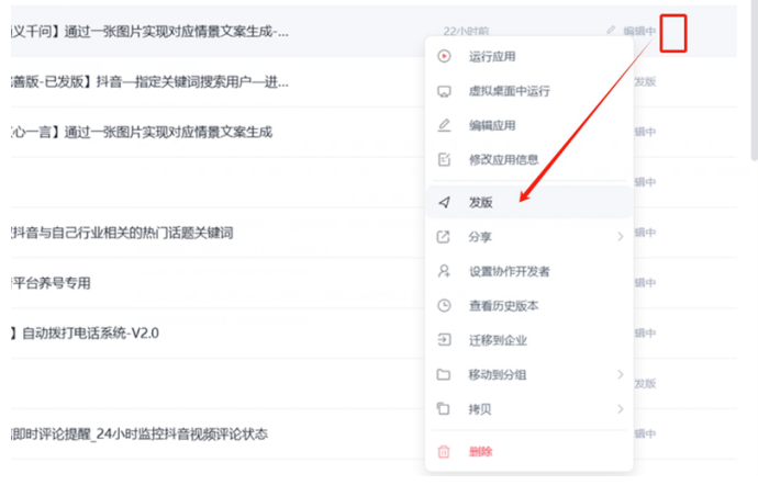 至于如何发布,可以选中在开发好的应用右侧“...”菜单里面的【发版】即可;