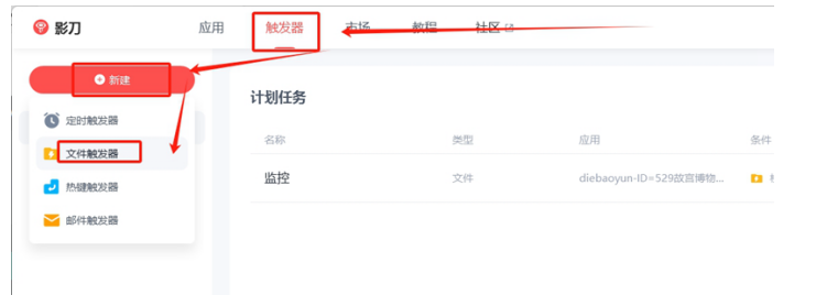 进行影刀客户端的“触发器”菜单,选择左侧的【新建触发器】,