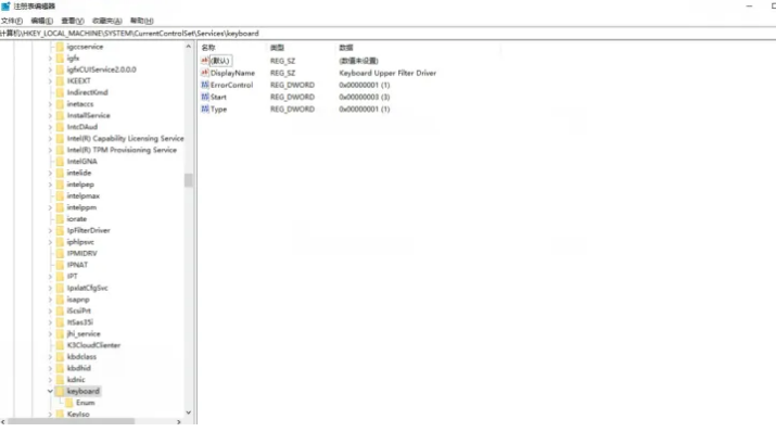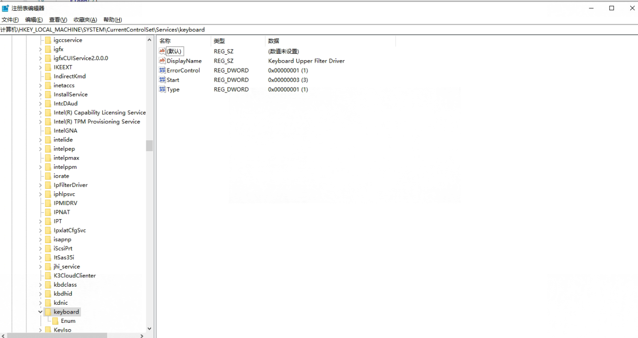 计算机\HKEY_LOCAL_MACHINE\SYSTEM\CurrentControlSet\Services\keyboard