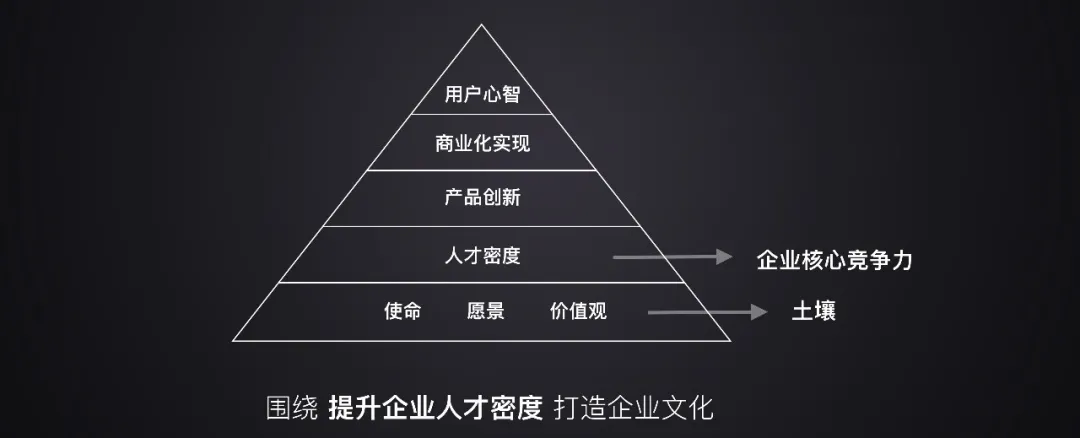优秀员工多了,提高公司“人才密度”,形成金字塔第二层,这也是企业核心竞争力所在。在人才密度之上构建极致的“产品”,再由产品驱动“商业化增长”。