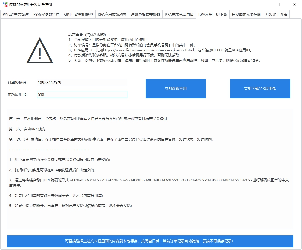 根据客服提供的订单授权码和应用ID编号,可以直接获取网站里面的应用;