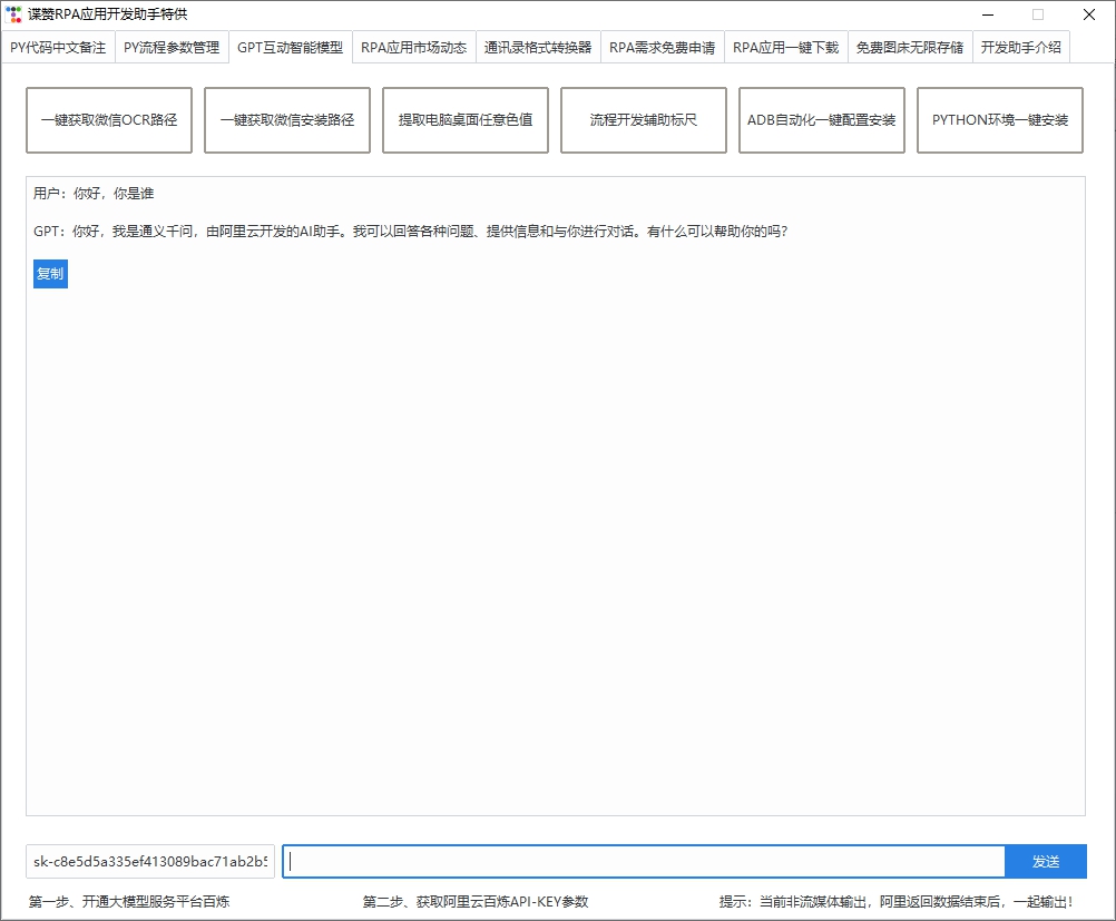 在客户端上默认加上了我们的API,如果自己没有,可以直接使用这个API直接会话,如果有自己的API,也可以替换成自己的API,自由对话都可以;此对话内容展现为非流媒输出,即待API生成结束后,再一起输出到文本框里面展现;