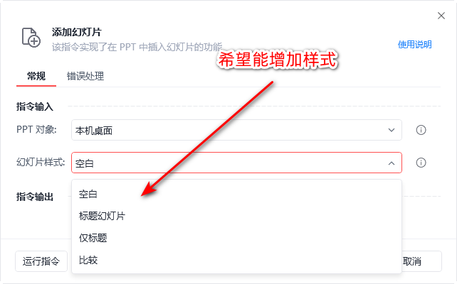 最近研究了一段时间了,琢磨出一个利用影刀PPT指令生成PPT的方法,极大节省时间,简直是经常做PPT人的福音,目前遇到了一个问题,就是这个PPT扩展,好像不是影刀官方的,里面高频使用的一条指令(添加幻灯片),里面可选项只有4个,就是空白,标题幻灯片,仅标题,比较,这4项的意思就是对应PPT主题的版式的,但是最重要的一个版式(标题和内容)却缺失了。