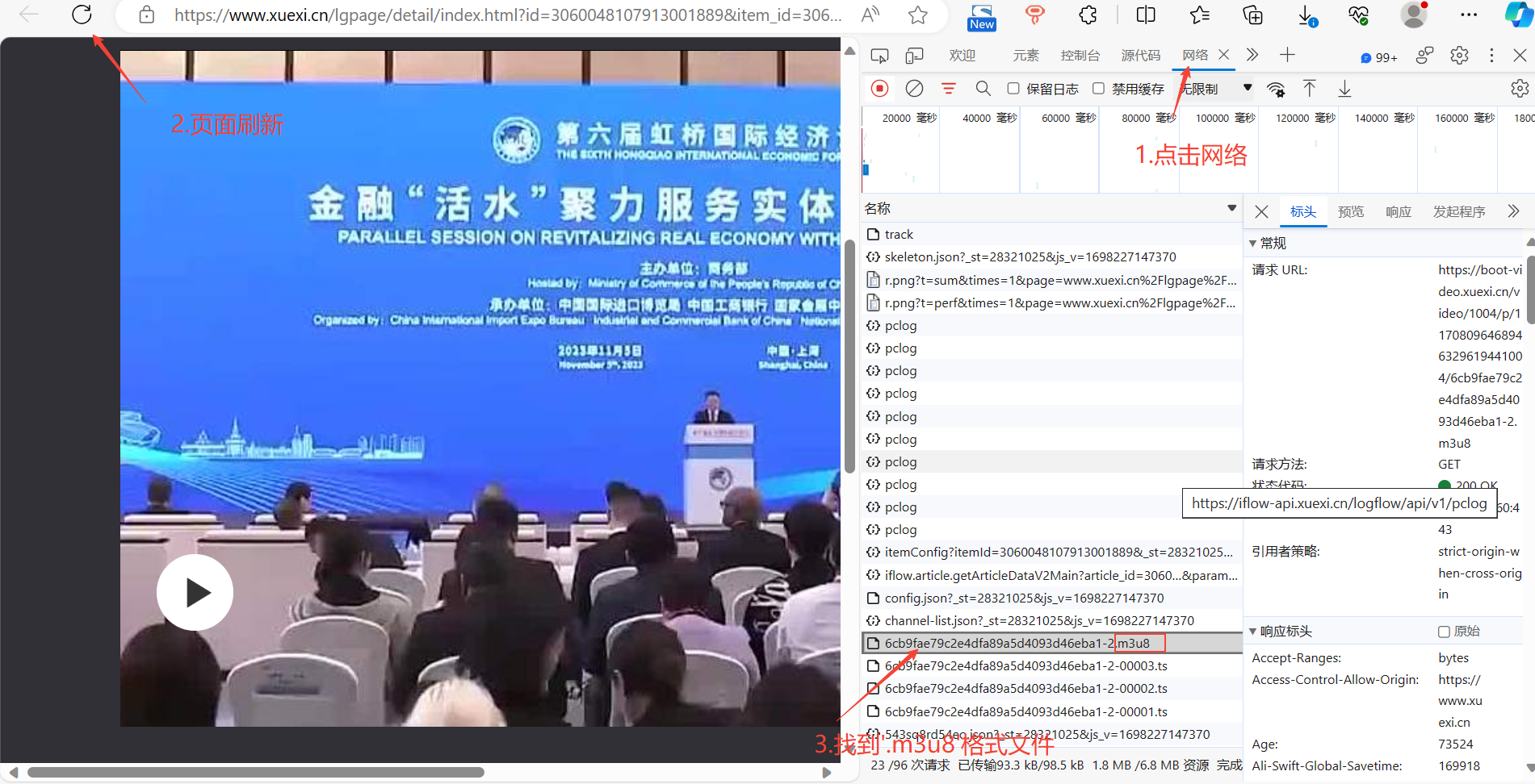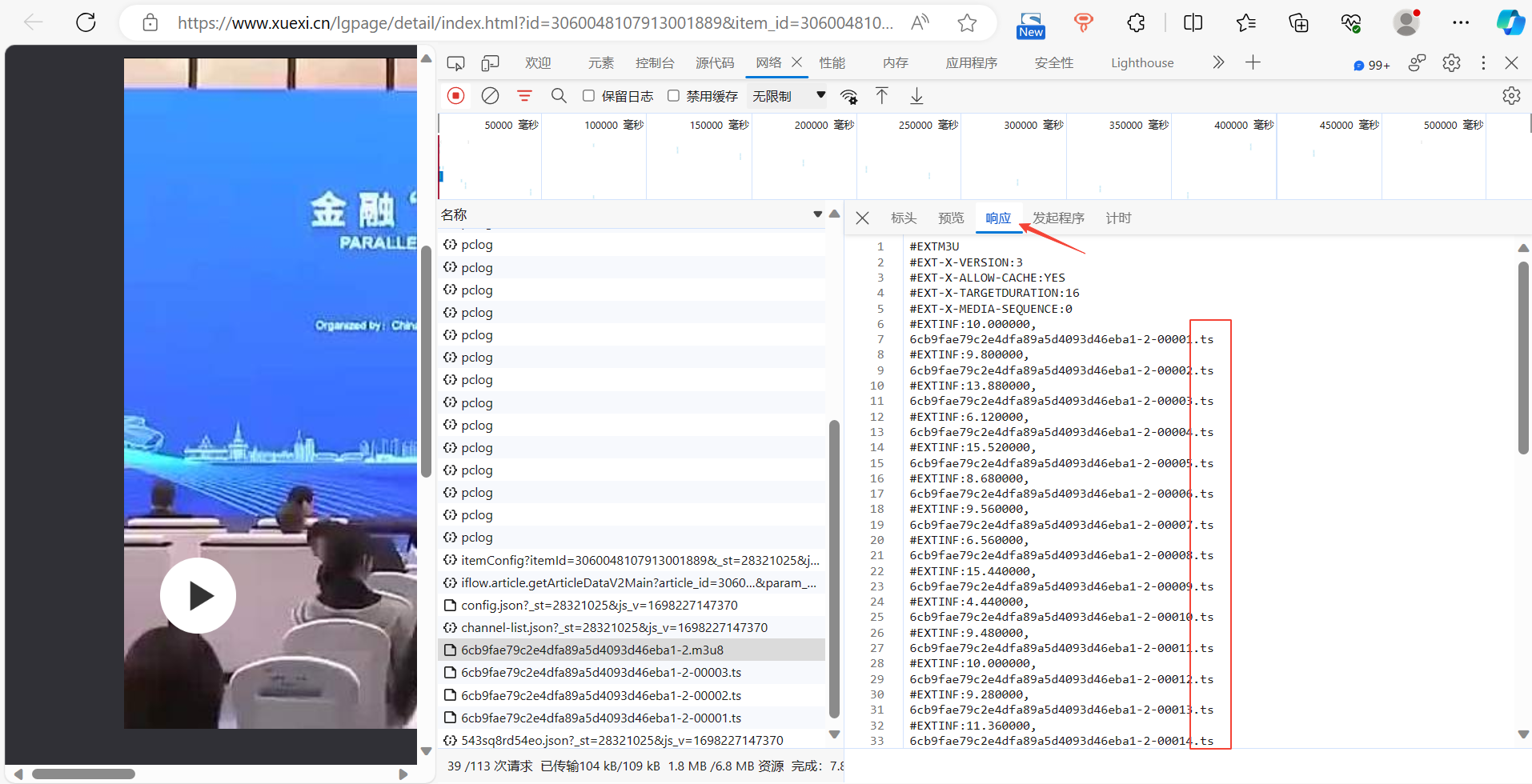 这个时候我们就要观察下这个视频的格式了,在网络中可以看到,这样的视频是由多个‘.ts’格式视频合成的‘.m3u8’格式视频