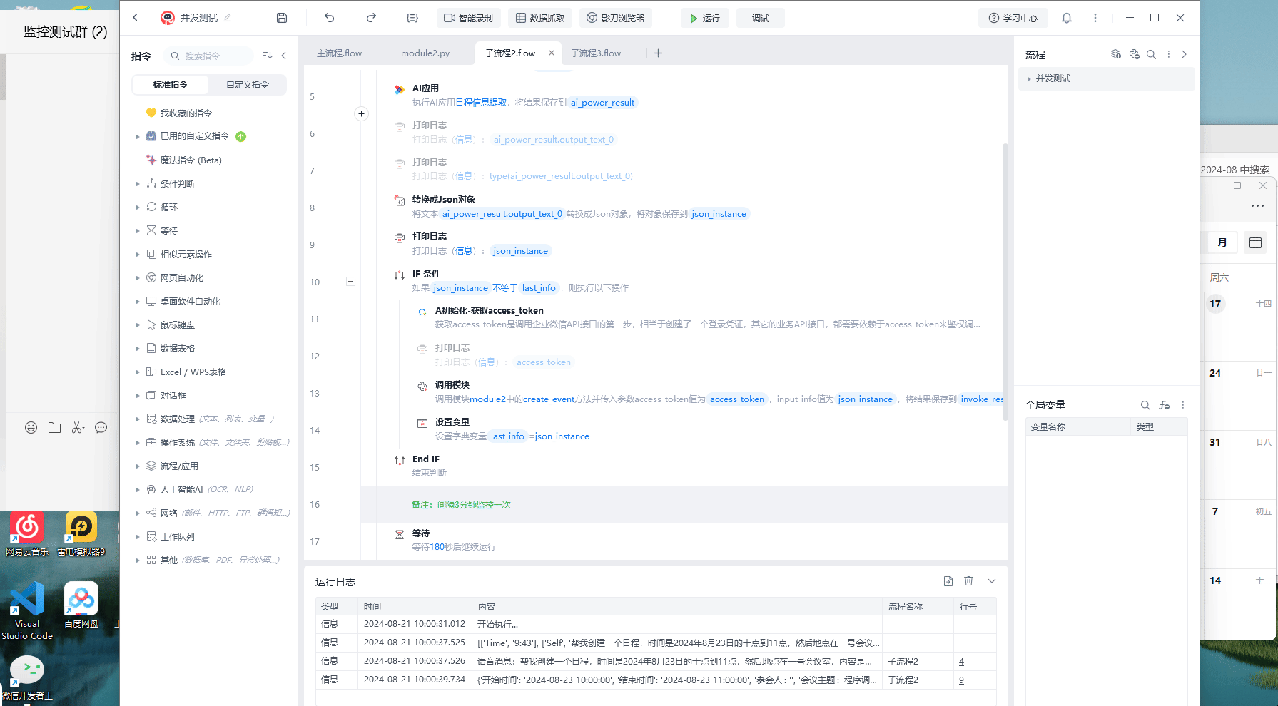 最后是通过企微的API来完成创建日程的操作,具体的操作可以参考这个文档(https://www.yingdao.com/community/detaildiscuss?id=8109bf97-4ea2-4baa-8f62-4fcbcaf2d006&tag=&from=userCenter&sort=createTime&page=1)中的步骤和企微日程创建接口文档来自建应用来完成token的获取和日程创建的请求发送。具体的代码示例如下: