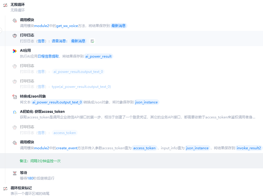 整体框架大致思路如下:首先我们监控一个微信群聊中的消息,监控到最新的语音消息并将其转换成文字信息获取到;然后将文字信息传入搭建好的AI服务中,通过大模型去提取语音消息中关键的信息点并回传;随后拿着回传的信息通过企微开放的日程创建API接口去完成日程创建动作。