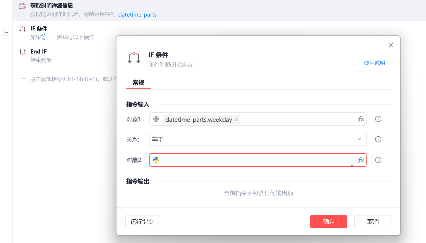 在主流程里获取了详细时间,如果是今天是周一至周三,运行一个子流程,周四至周日运行另外一个,这里应该怎么填写呢