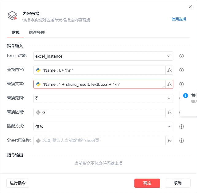 如图所示,其中shuru_result.TextBox2是自定义对话框中一个输入框的内容,Name : (.+?)\n表示Name : 到换行符的内容。