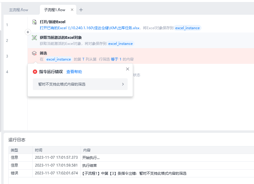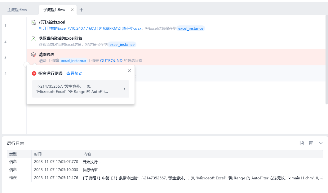今天影刀执行excel 的筛选和清除筛选突然就开始报错了,求解!谢谢