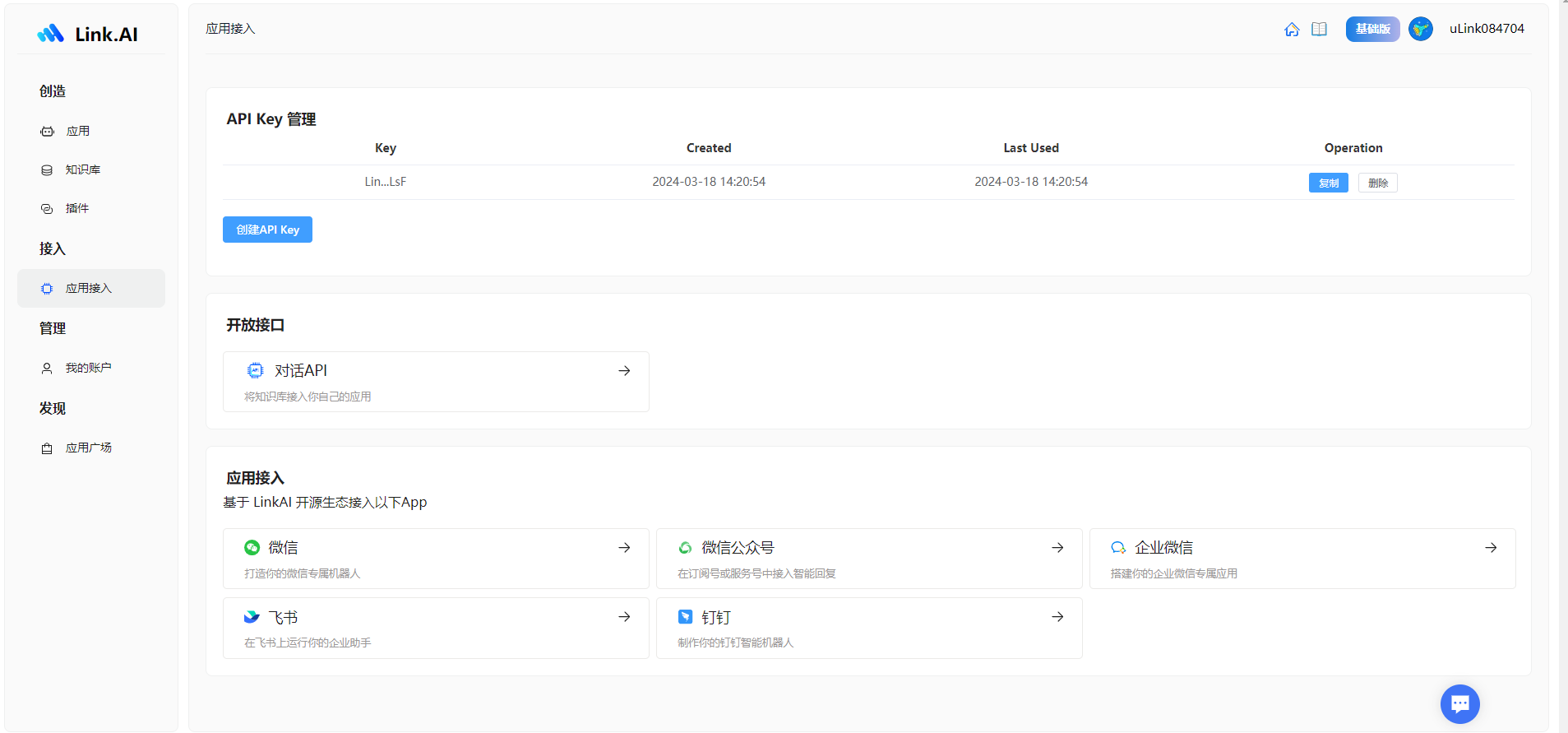 2、创建API Key,这个Key就是配置文件中的linkai_api_key将它复制到配置文件中