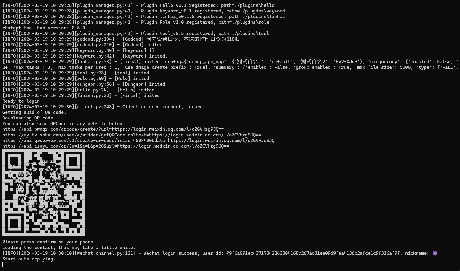 3、命令执行成功后会弹出一个二维码,扫码后出现Start auto replying说明启动成功,这个时候我们的微信号就成为机器人了