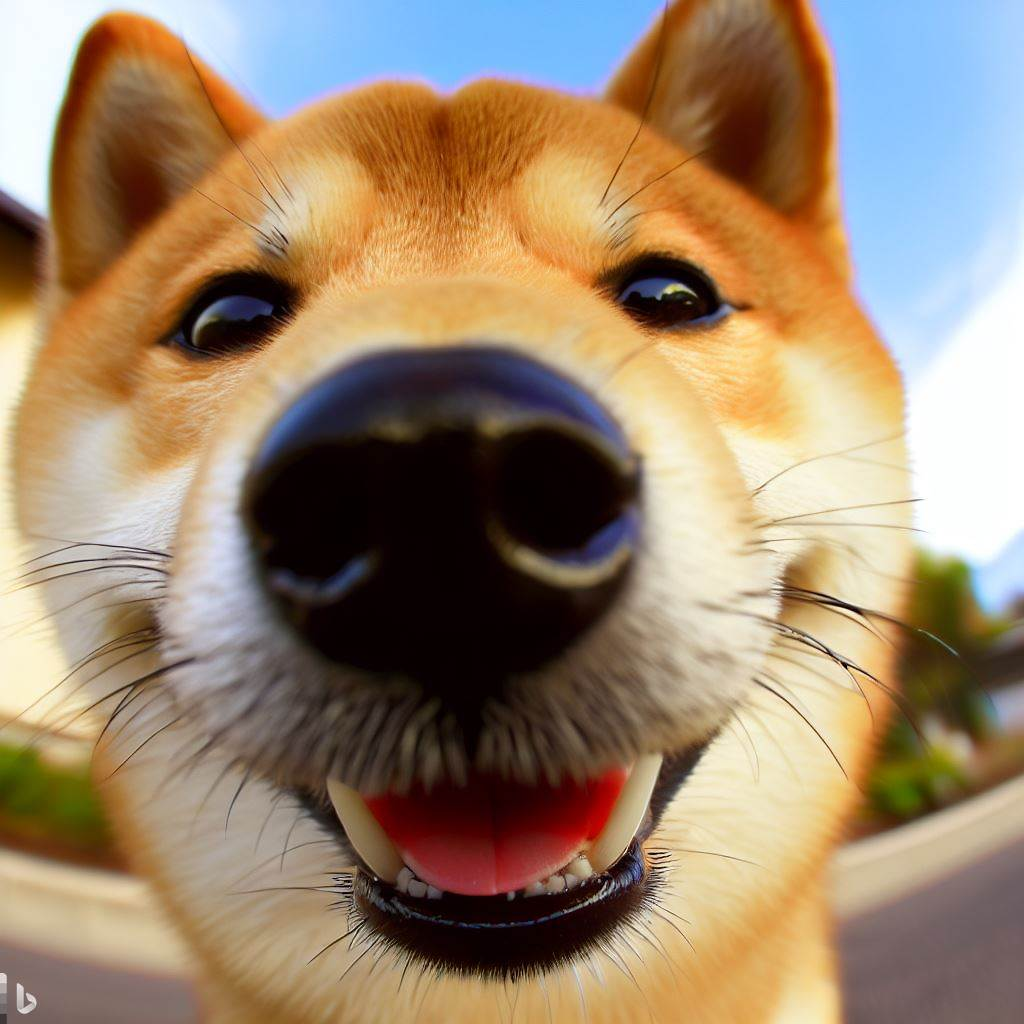 A smiling one-year-old Shiba Inu, focuse on the nose, fish eye len, 1.6f, portrait