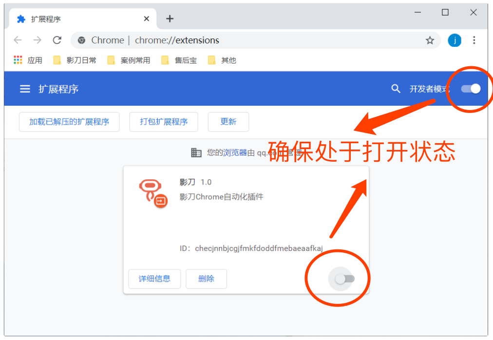 Step2:插件安装完成后,打开 Chrome 浏览器输入chrome://extensions进入到扩展程序页面并确保【开发者模式】、【影刀插件】都处于打开的状态
